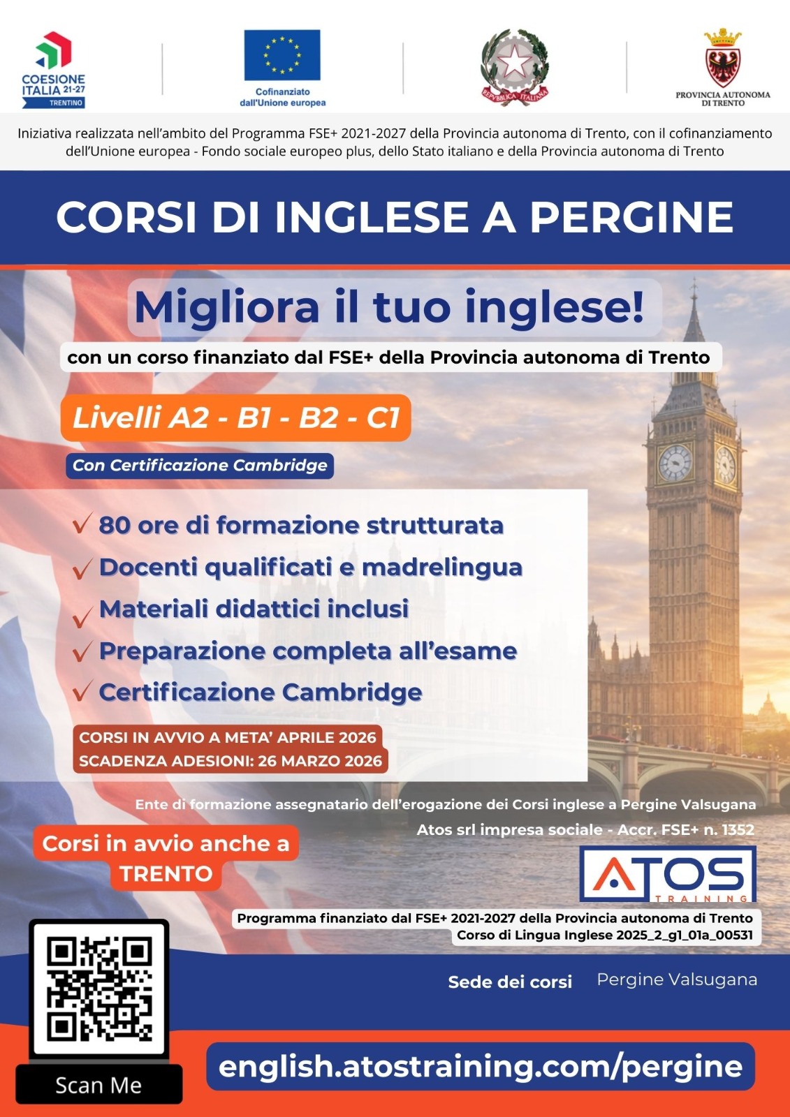 Descrizione Descrizione80 ore di formazione, con docenti qualificati e Certificazione Cambridge inclusa.Avvio: metà aprile 2026Adesioni entro: 26 marzo 2026Tutte le informazioni qui:https://english.atostraining.com/pergine